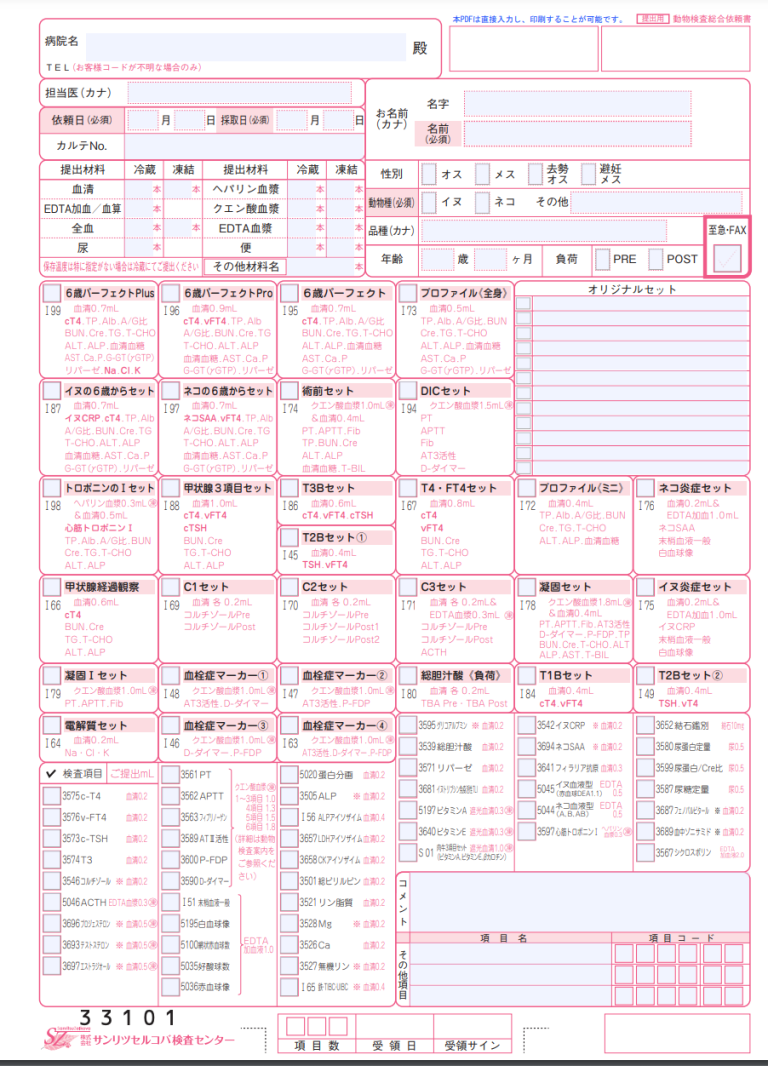 お取引開始には、動物病院様の登録が必要となります。新規で検査をご依頼の際は、登録用紙をダウンロード、必要事項を記入の上、FAXにてお申し込みください。登録完了後、病院コードをお知らせ致します。